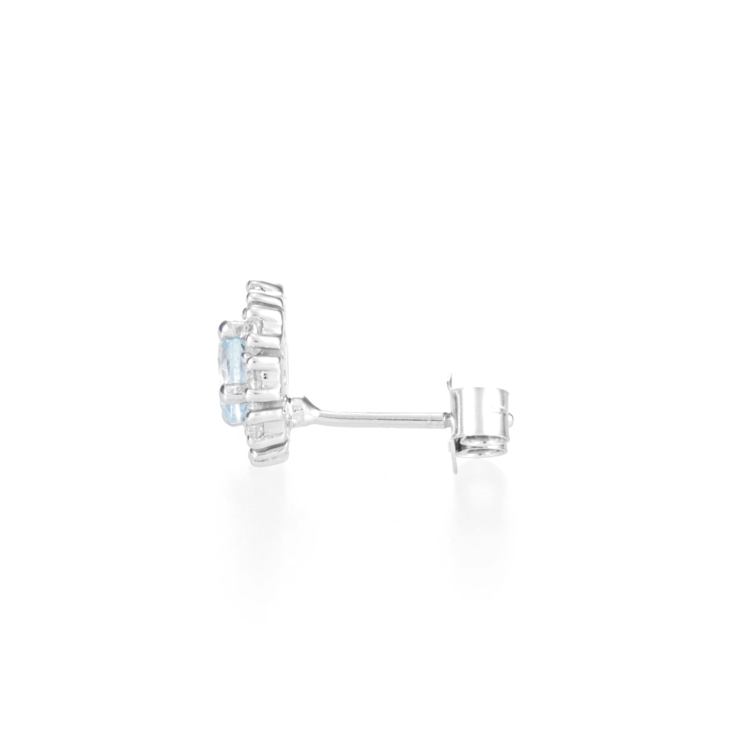 Stříbrné náušnice připomínající květ s centrálním nebesky modrým topazem a akcentními bílými topazy kolem. Kameny uchyceny v krapnách. Zapínání na puzetu zajišťuje pohodlné a bezpečné nošení.