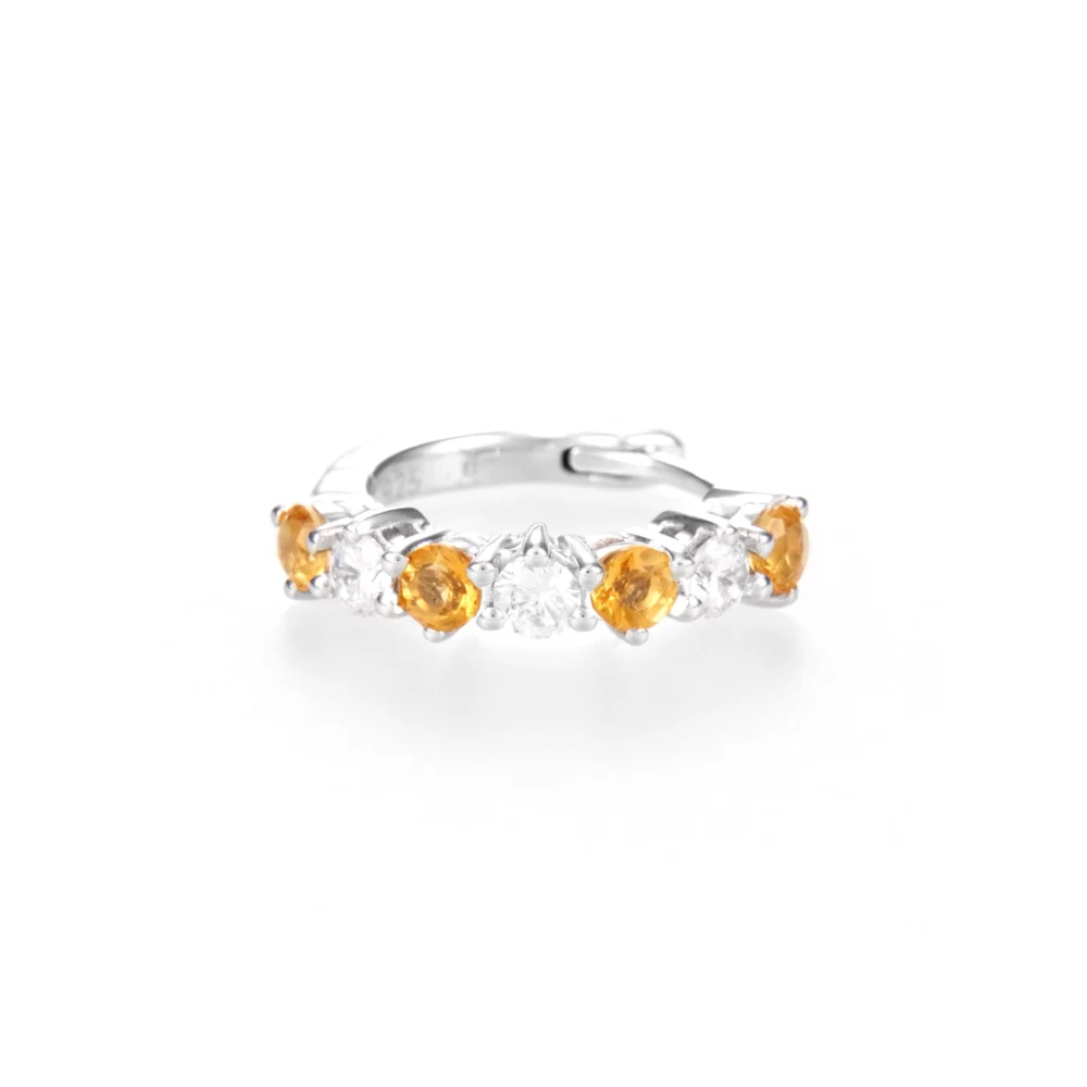 Stříbrné kruhové náušnice s kulatými citríny a bílými topazy, osazenými po viditelné části obvodu. Díky uchycení v krapnách vyniká maximální objem a zářivá barva kamenů. Zapínání na kloubový mechanismus pro pohodlné nošení.