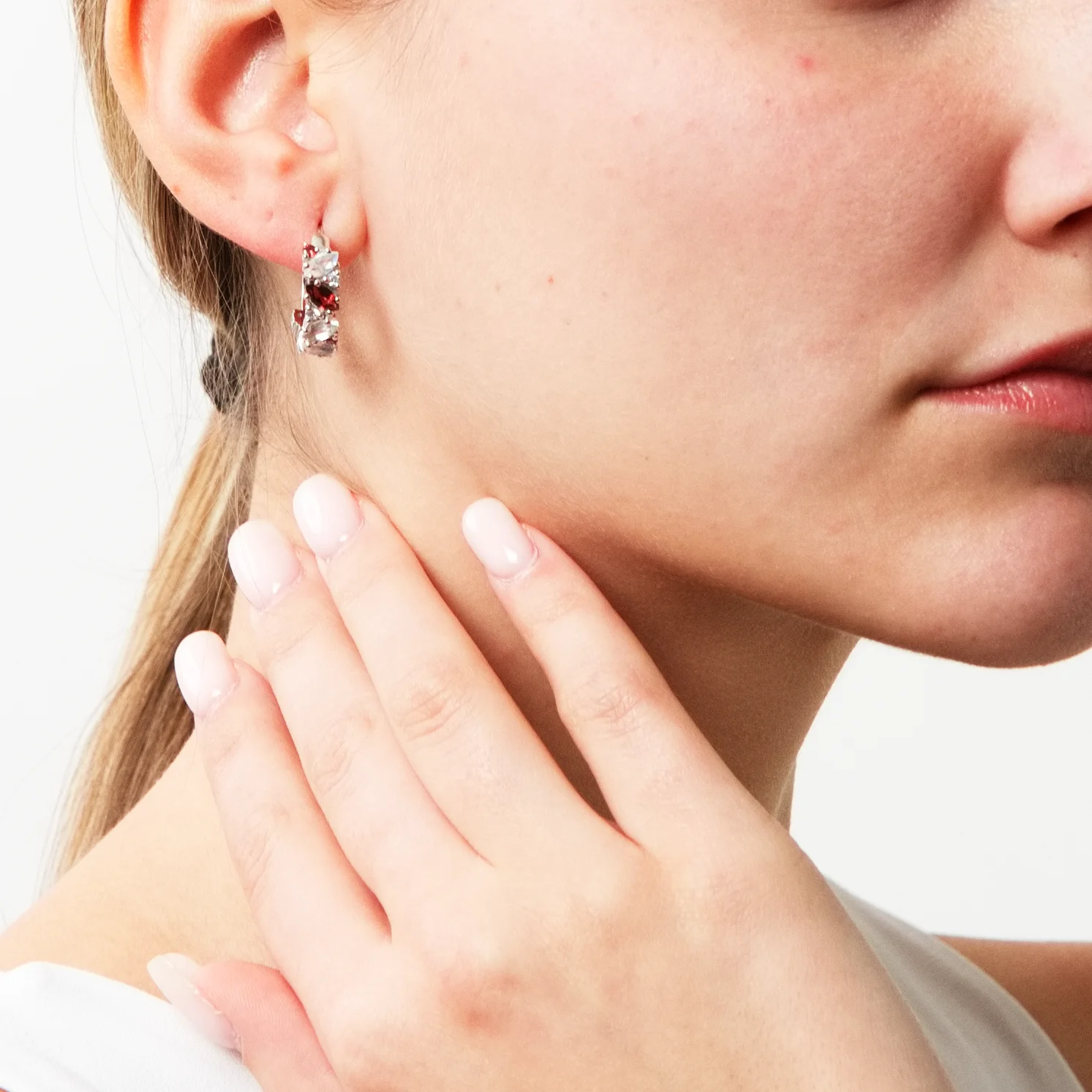 Stříbrné kruhové náušnice v harmonizující kombinaci měsíčního kamene, granátu a bílého topazu. Kameny jsou v různých tvarech i velikostech pro vytvoření bohatého a dynamického designu.