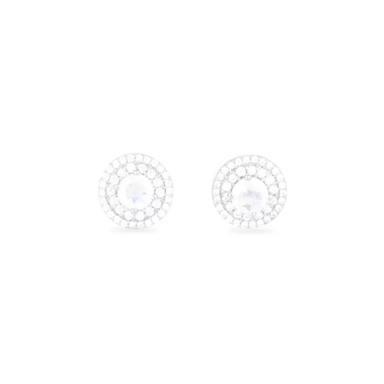 Stříbrné visací náušnice s kulatým opálem v hladkém cabochon brusu, elegantně zavěšeným uprostřed bohatě zdobeného rámečku. Opál s jemným irizujícím leskem je obklopen třpytivými bílými topazy, které vytvářejí nádherný kontrast a umocňují lesk celého šperku.