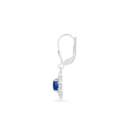 Stříbrné visací náušnice s kulatým opálem v hladkém cabochon brusu, elegantně zavěšeným uprostřed bohatě zdobeného rámečku. Opál s jemným irizujícím leskem je obklopen třpytivými bílými topazy, které vytvářejí nádherný kontrast a umocňují lesk celého šperku.