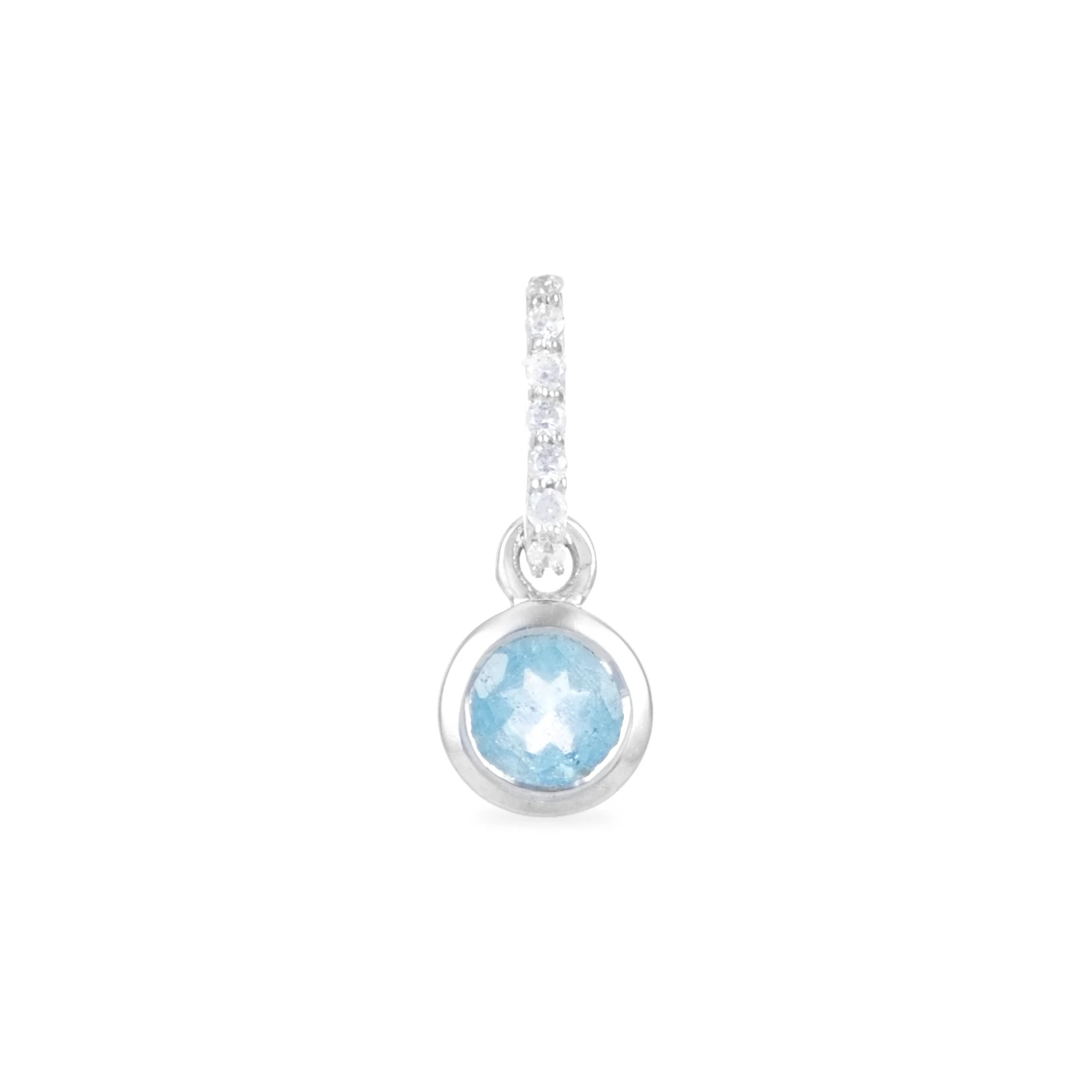 Stříbrný přívěsek s kulatým akvamarínem v lunetovém osazení. Závěs ve tvaru „B“, odkazující na značku Brillamento, je zdoben drobnými bílými topazy, které šperku dodávají sofistikovaný třpyt a eleganci.