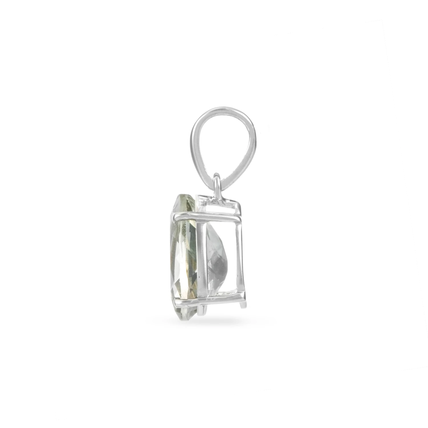Stříbrný přívěsek se solitérním zeleným ametystem o velkorysé velikosti 10×14 mm. Kámen je bezpečně uchycen čtyřmi krapnami, což zvýrazňuje jeho charakteristickou barvu a lesk. Minimalistický design bez zbytečného zdobení umožňuje vyniknout kráse samotného kamene.