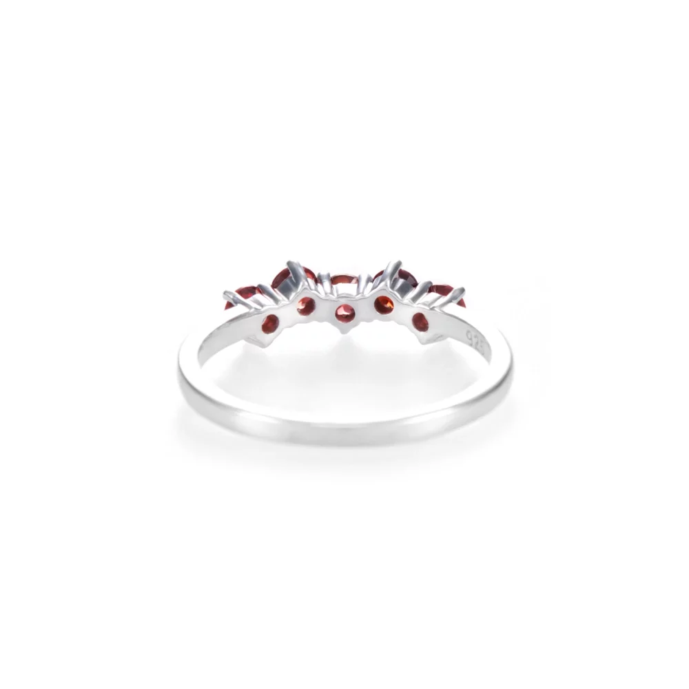 Stříbrný prsten s pěti drobnými granáty, zasazenými ve zvlněné linii ve tvaru W, což dodává prstenu zajímavou dynamiku.