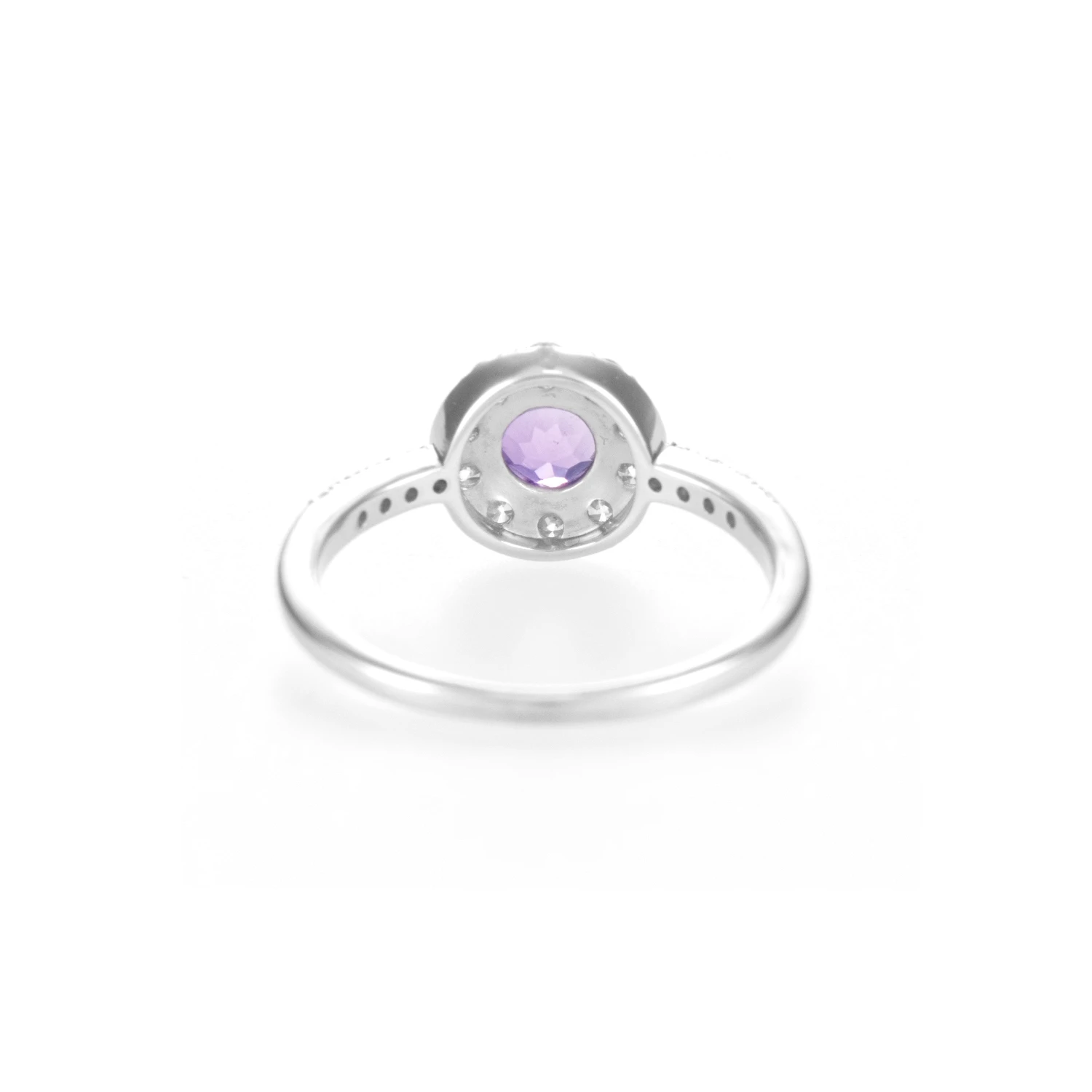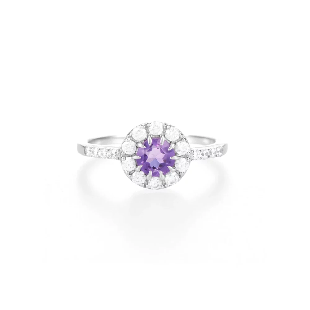 Stříbrný prsten s centrálním ametystem obklopeným bílými topazy. Ametyst je uchycen prodlouženými krapnami. Výrazně velké bílé topazy lemují střední kámen. Ramena prstenu jsou osazena menšími bílými topazy. Elegantní design kombinuje fialovou a čirou barvu kamenů.