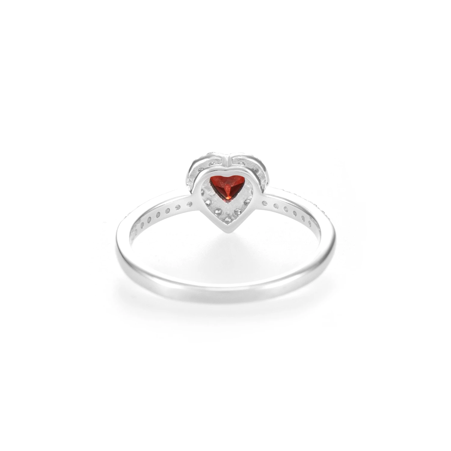 Romantický stříbrný prsten s granátem ve tvaru srdce, obklopený jiskřivými bílými topazy, které zdobí jak centrální kámen, tak i subtilní ramena stříbrného prstenu.