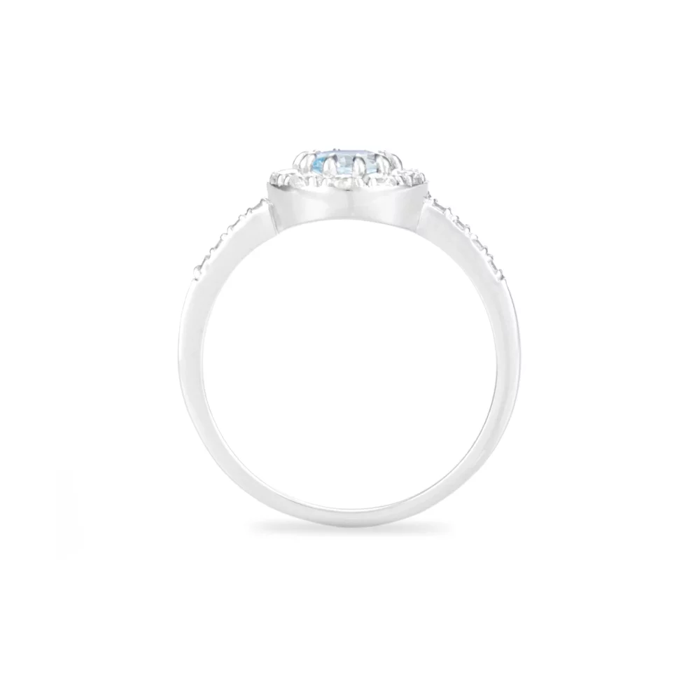 Stříbrný prsten s centrálním nebesky modrým topazem obklopeným bílými topazy. Modrý topaz je uchycen prodlouženými krapnami. Výrazně velké bílé topazy lemují střední kámen. Ramena stříbrného prstenu jsou osazena menšími bílými topazy. Elegantní design kombinuje modrou a čirou barvu kamenů.