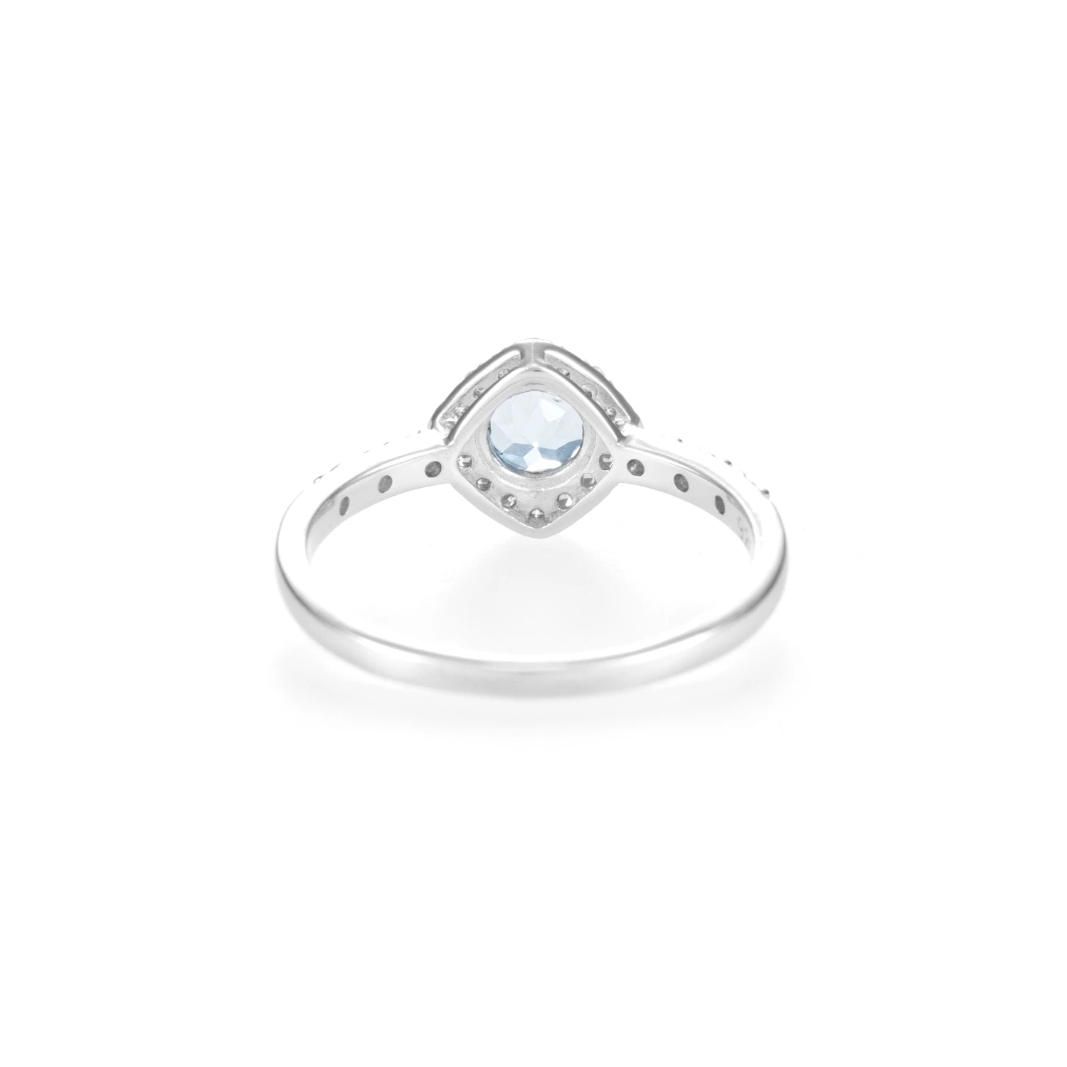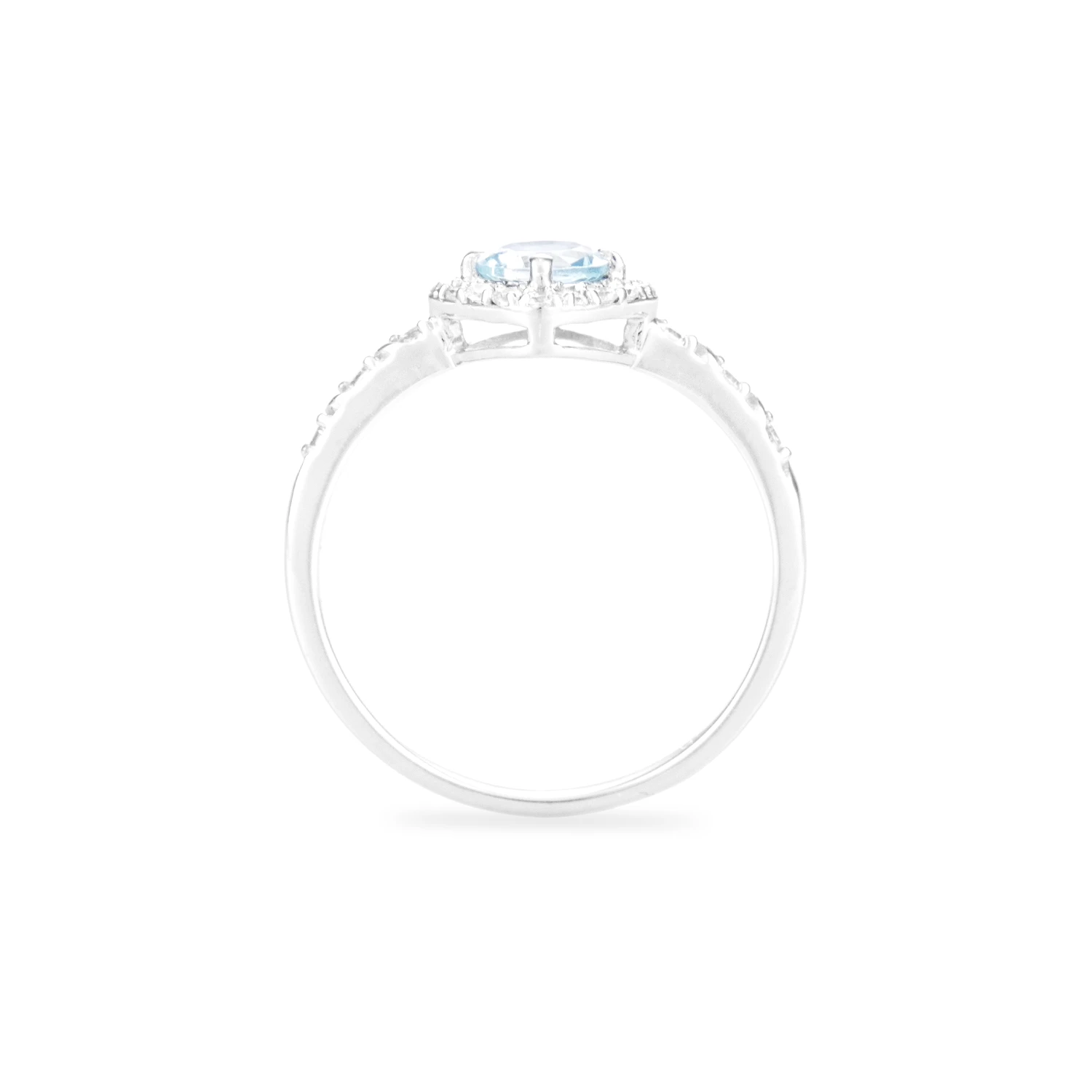 Centrální nebesky modrý topaz je obklopen bílými topazy, které vytvářejí halo efekt, zdůrazňující krásu centrálního kamene. Akcentní bílé topazy rovněž zdobí ramena stříbrného prstenu, což zvyšuje jeho eleganci.